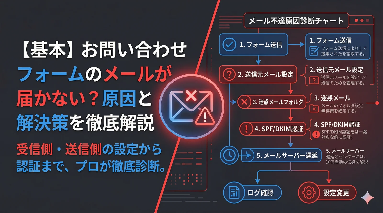 お問い合わせフォームからのメールが届かない原因は、 サーバーの制約、認証設定の不足、SMTP未使用の3つが主な要因です。